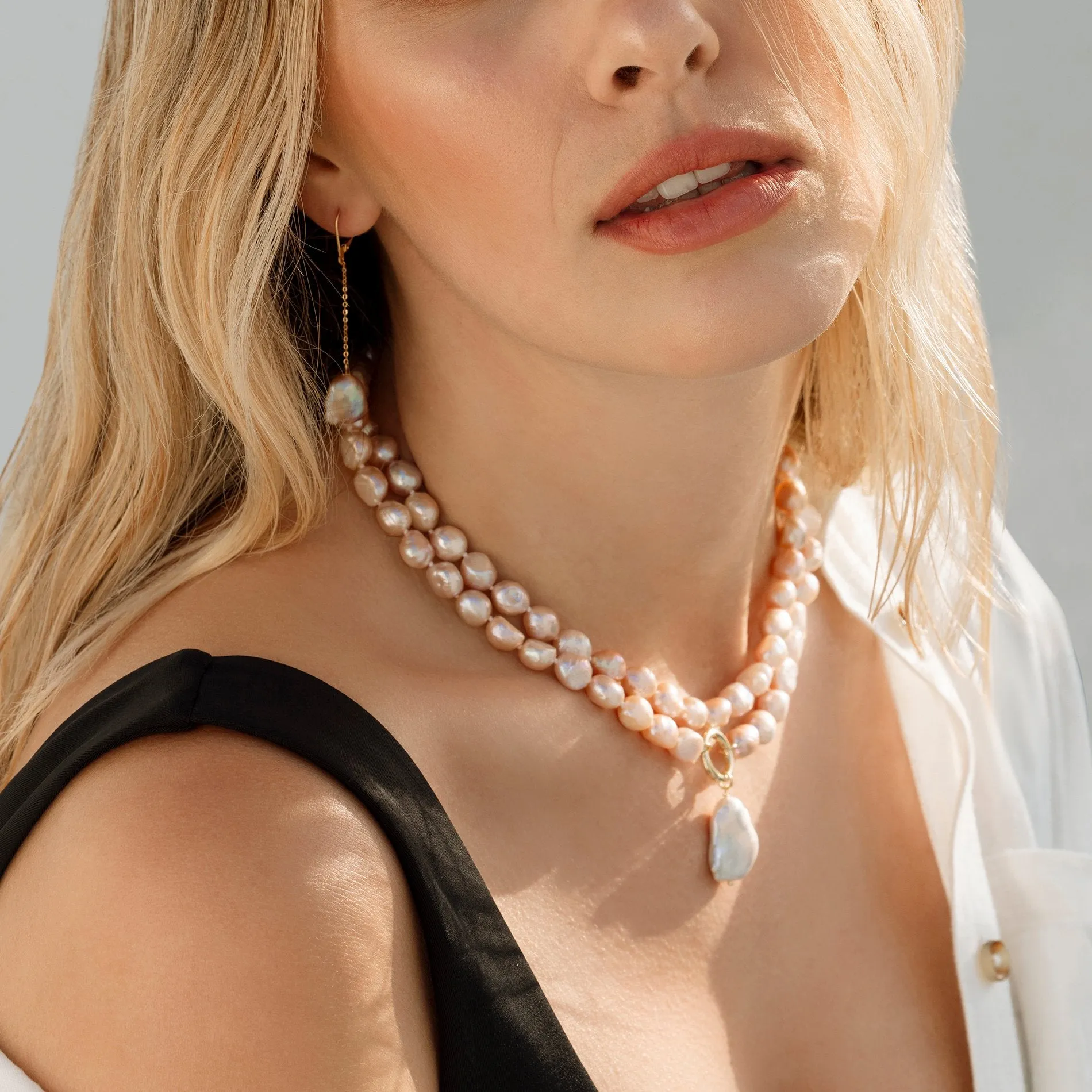 This 9.5-10.5mm oval pink freshwater double strand pearl necklace is certain to grab the attention of anyone who sees this beauty. This pearl necklace is compiled of two strands of hand picked oval pink freshwater pearls with high grade luster that has an exquisite 14-16mm dangling baroque pearl dangling. This necklace feature a 17" extendable to 18" Sterling silver or Yellow gold plated clasp