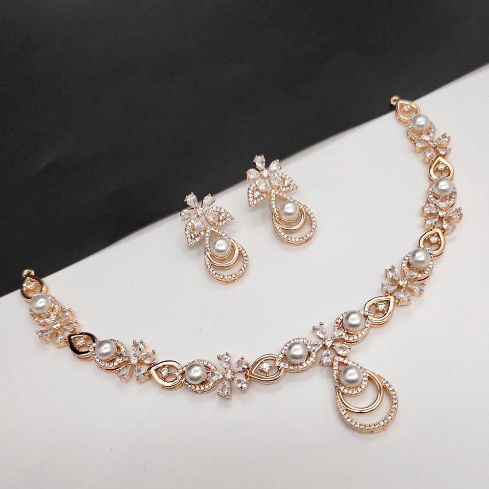 Upgrade your jewelry collection with the exquisite Aamrapali Rose Gold Plated AD Necklace Set. Made with precision and artistry, this set is adorned with stunning AD stones, adding a touch of elegance to any outfit. Experience the beauty of traditional Indian jewelry in a modern setting, perfect for any occasion...Note: Image may be vary slightly from the actual product.