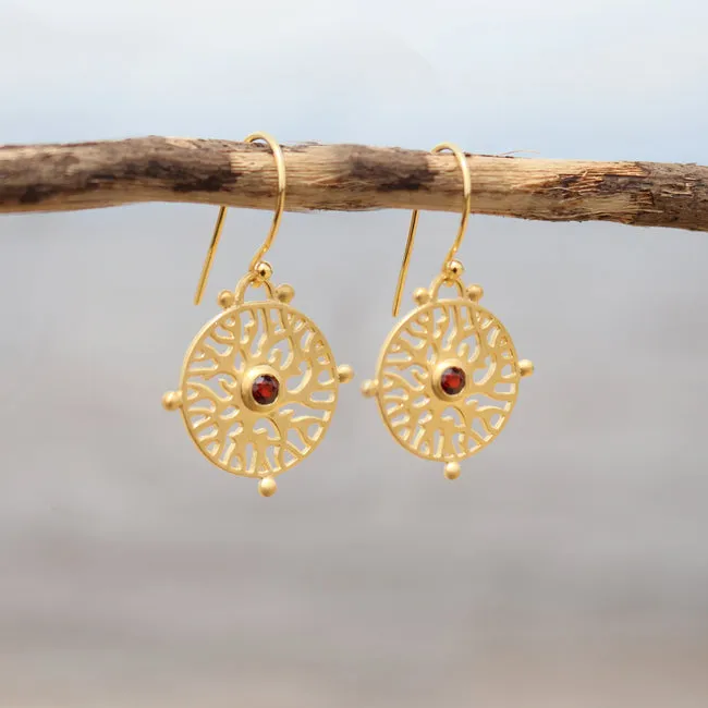 Our Aspera dangle earrings are named after the coral species Acropora Aspera. Each earring features a round branching coral pattern radiating away from a 3mm natural rich garnet stone. Each earring has been crafted from sustainable recycled 925 sterling silver and 18K gold plated before being carefully hand brushed to an elegant matte finish. Our designs come packaged in a beautiful complementary round gift box with a dark velvet inlay, ideal for gifting or storing your jewelery.