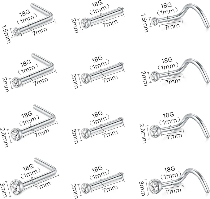 Size Options: The nose rings are all 18G (1mm) thick, with circular options in 8mm, 10mm and 12mm diameters. Nose screws, also 18G (1mm), come in 7mm length and L-shape, straight pin, or hook styles. The top cubic zirconia stones are available in 1.5mm, 2mm, 2.5mm, and 3mm sizes, offering versatile styling choices.