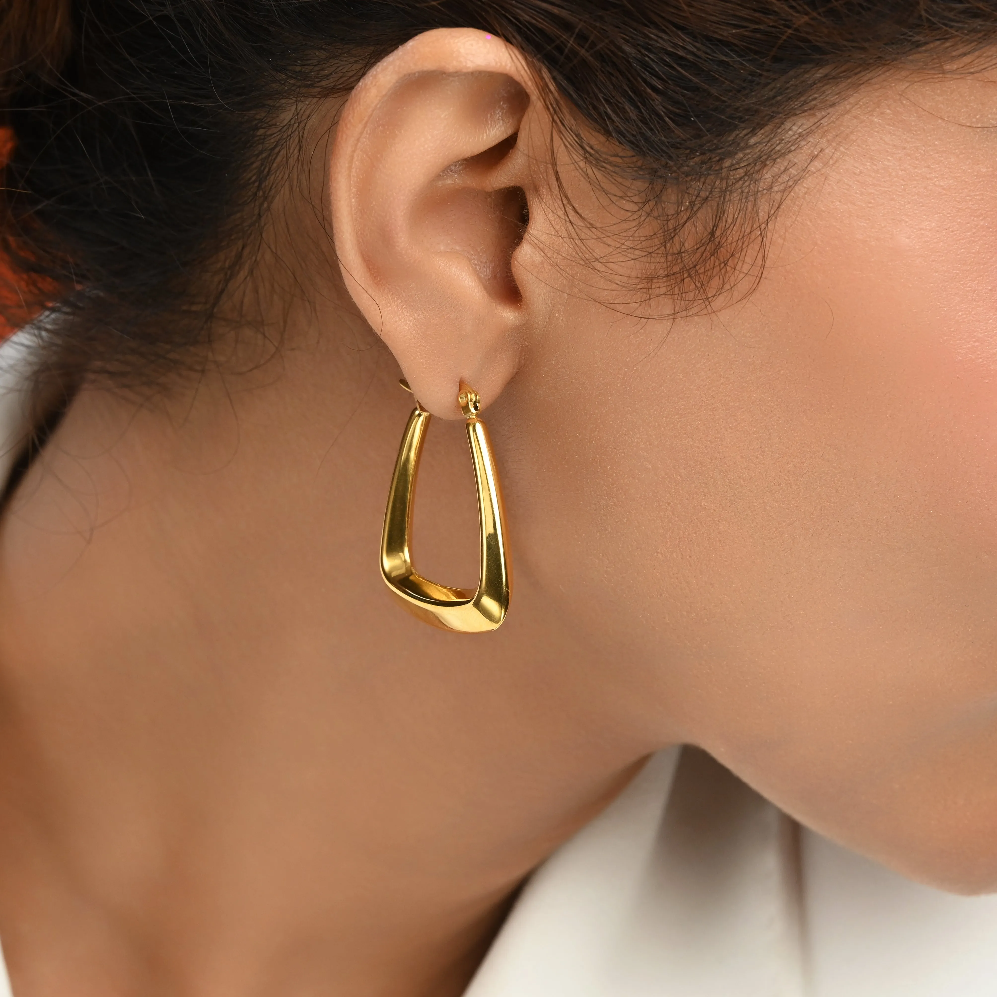 These elegant hoop earrings feature a contemporary V-shaped design, crafted in high-polished 18K Gold plated for a sleek finish. Their lightweight construction ensures comfort, making them perfect for everyday wear or special occasions.