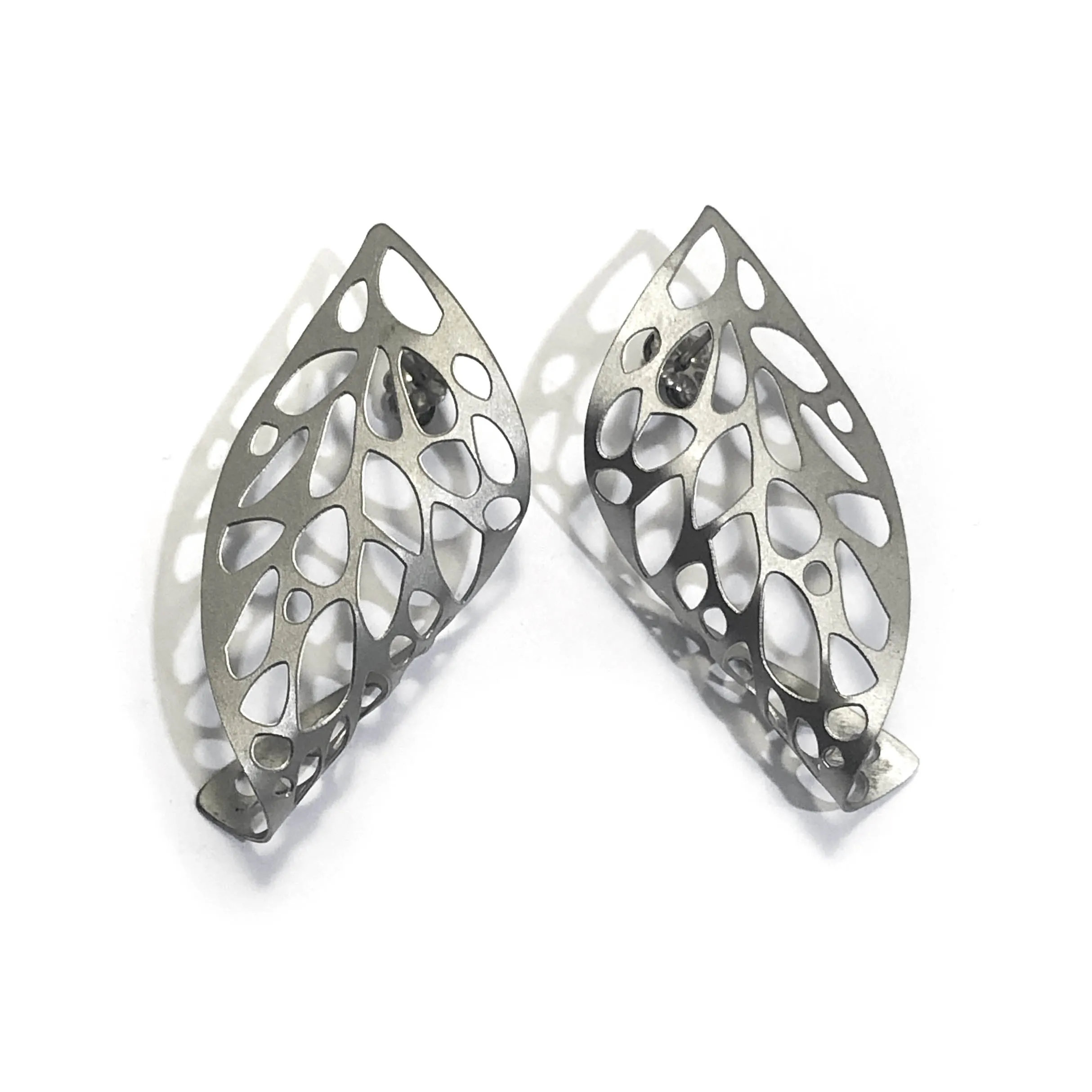 Inspired by leaf skeletons, I wanted to translate these delicate designs into something just as light but able to last a lifetime. Using titanium allows me to keep the fine detail and remain looking delicate, while remaining strong. Using anodising (an electrical process where voltage is used to colour titanium without dyes or adding anything to the metal) I am able to change the colour of the titanium into shimmering unique colour-ways