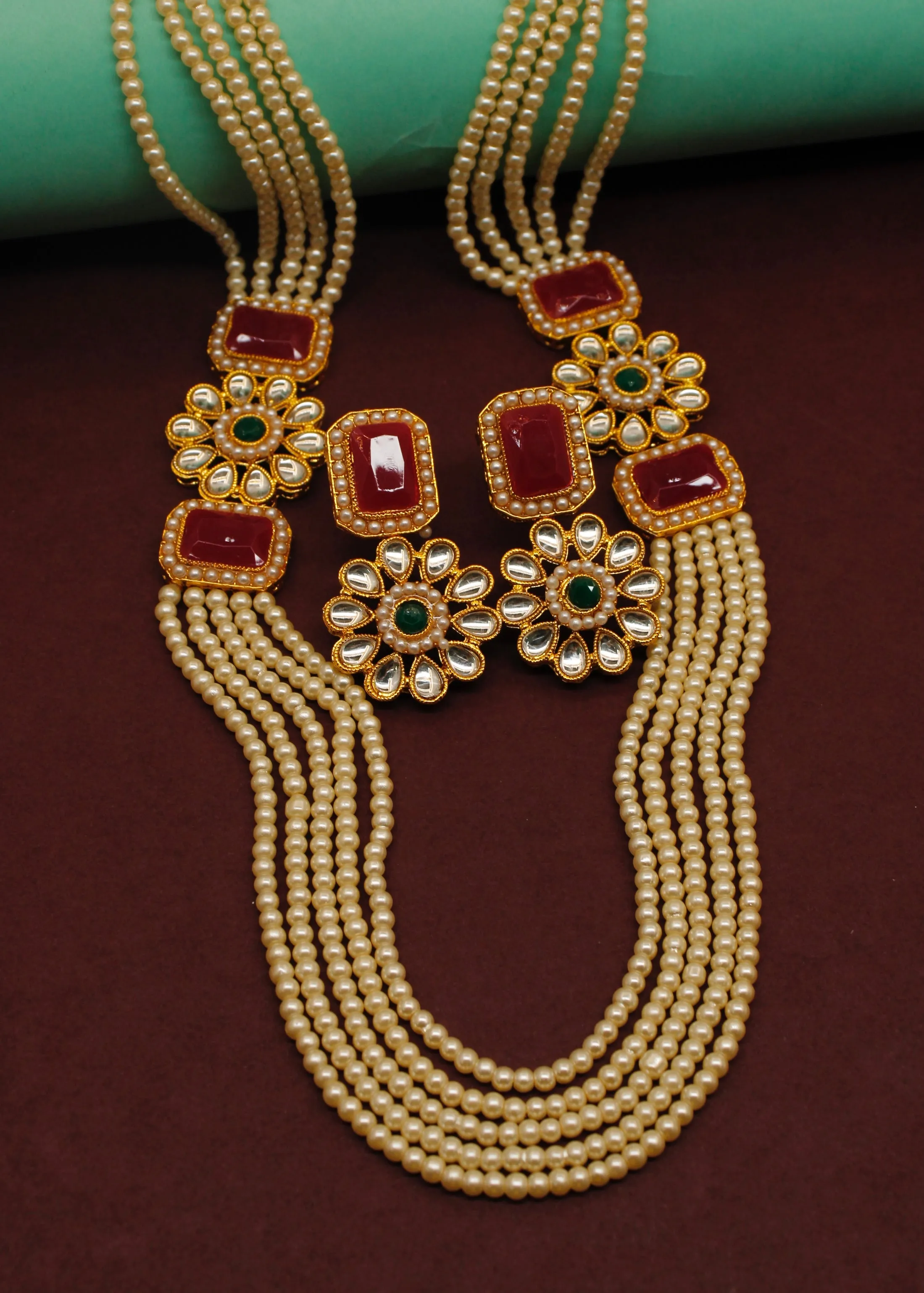 Create your different fashion statement by clubbing this pearl beads necklace set with your occasional outfits. It is studded with pink-green stone long with pearl beads and has detail carving done which lend classy look to this set. This golden finish necklace is crafted from metal and ensures high durability. It is easy to wear and comfortable to hold all day long.