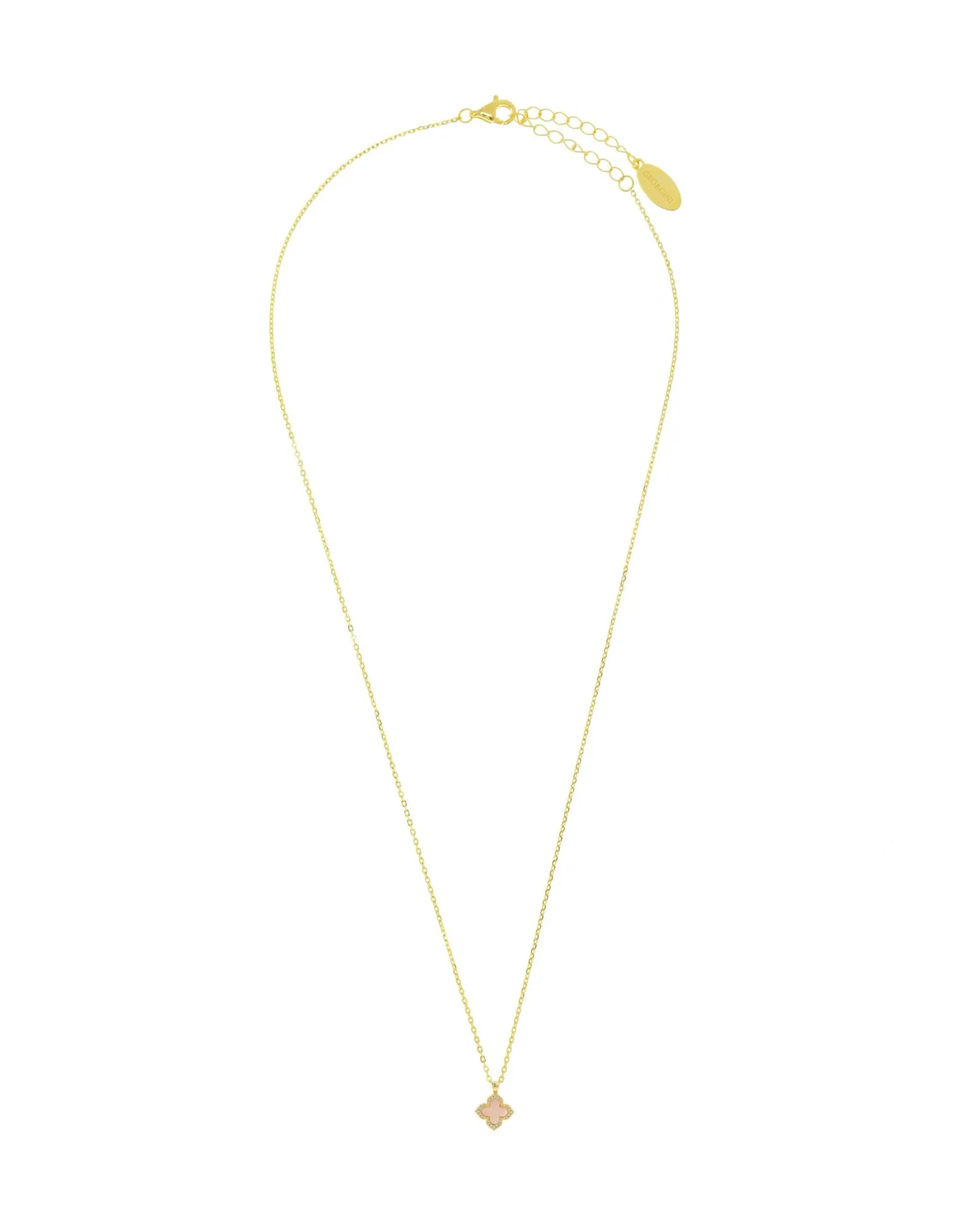 Embrace timeless elegance with the Sydney Soiree Fairwater Pendant. This exquisite piece showcases an iridescent mother-of-pearl pointed four leaf clover beautifully adorned with shimmering stone set edging on both sides. Crafted from 18k gold- plated 925 sterling silver, and measures 45cm long.