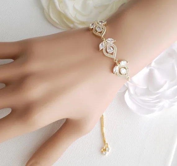 This Meghan gold slider bracelet is an elegant piece for weddings or any special occasion. These beautiful bridal slider bracelets are available with matching Meghan earrings and necklaces to complete your wedding day look.