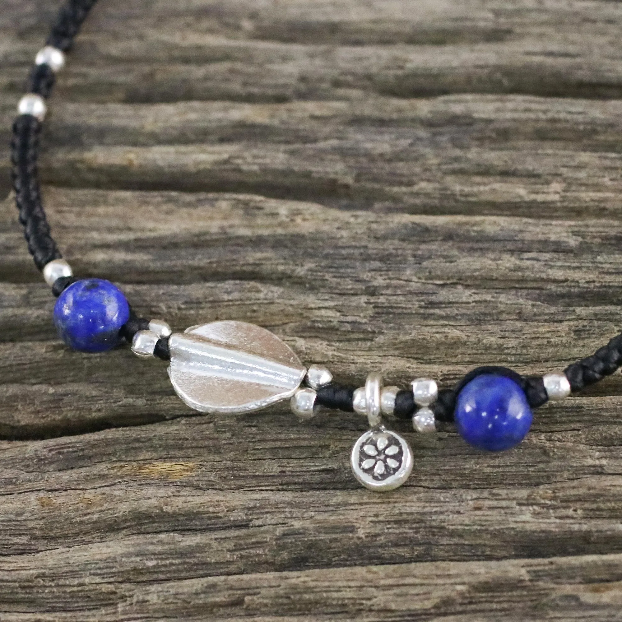 Working with high-purity Karen hill tribe silver, artisan Samart Takham creates a bracelet with authentic Thai style. The artisan adorns a braided black cord with silver beads, flanked by globes of deep blue lapis lazuli. The bracelet features a sliding knot for adjustable length, as well as a petite flower charm.