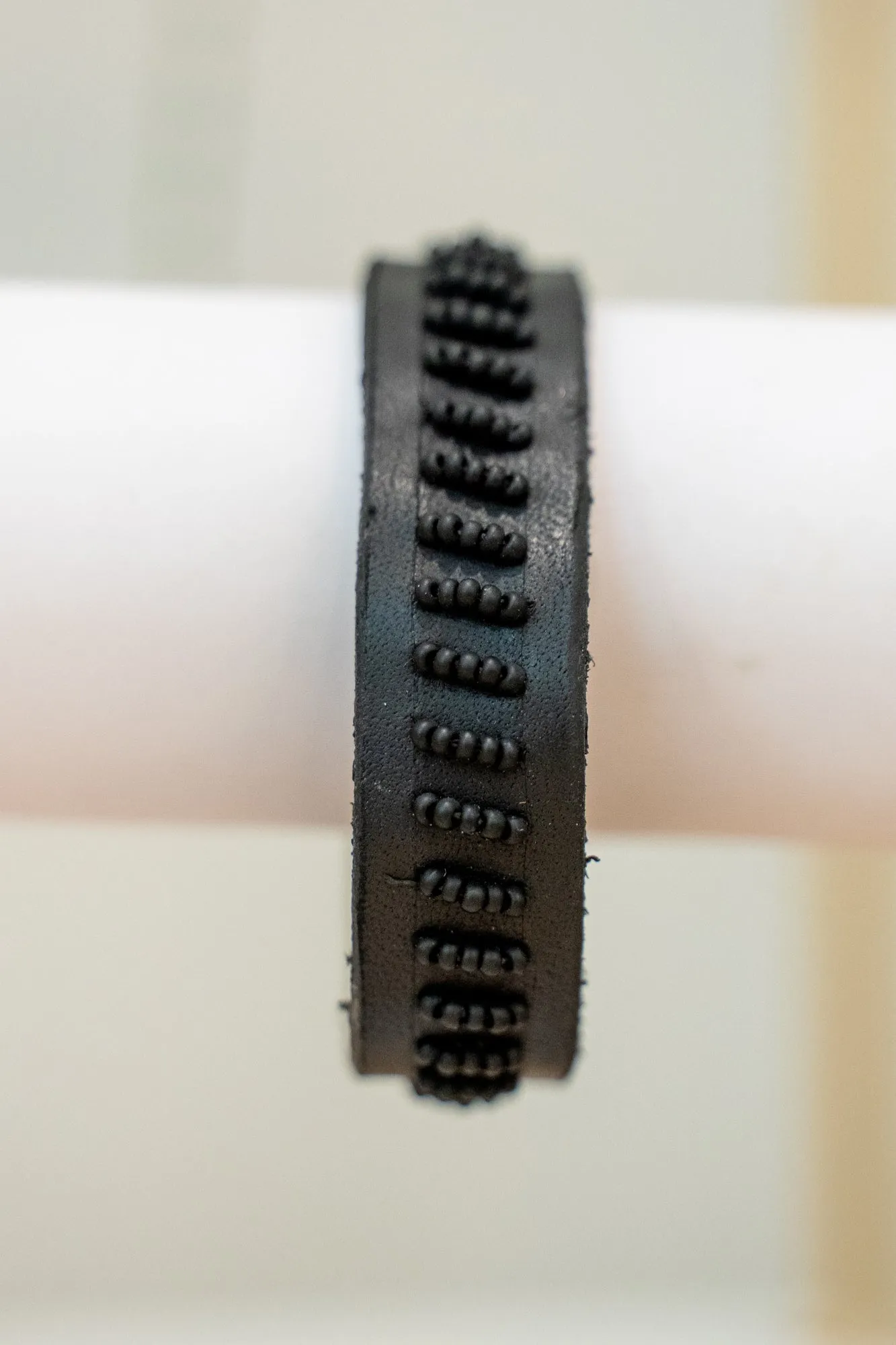 - Materials: Handcrafted from Haitian cow leather, solid brass hardware, glass beads