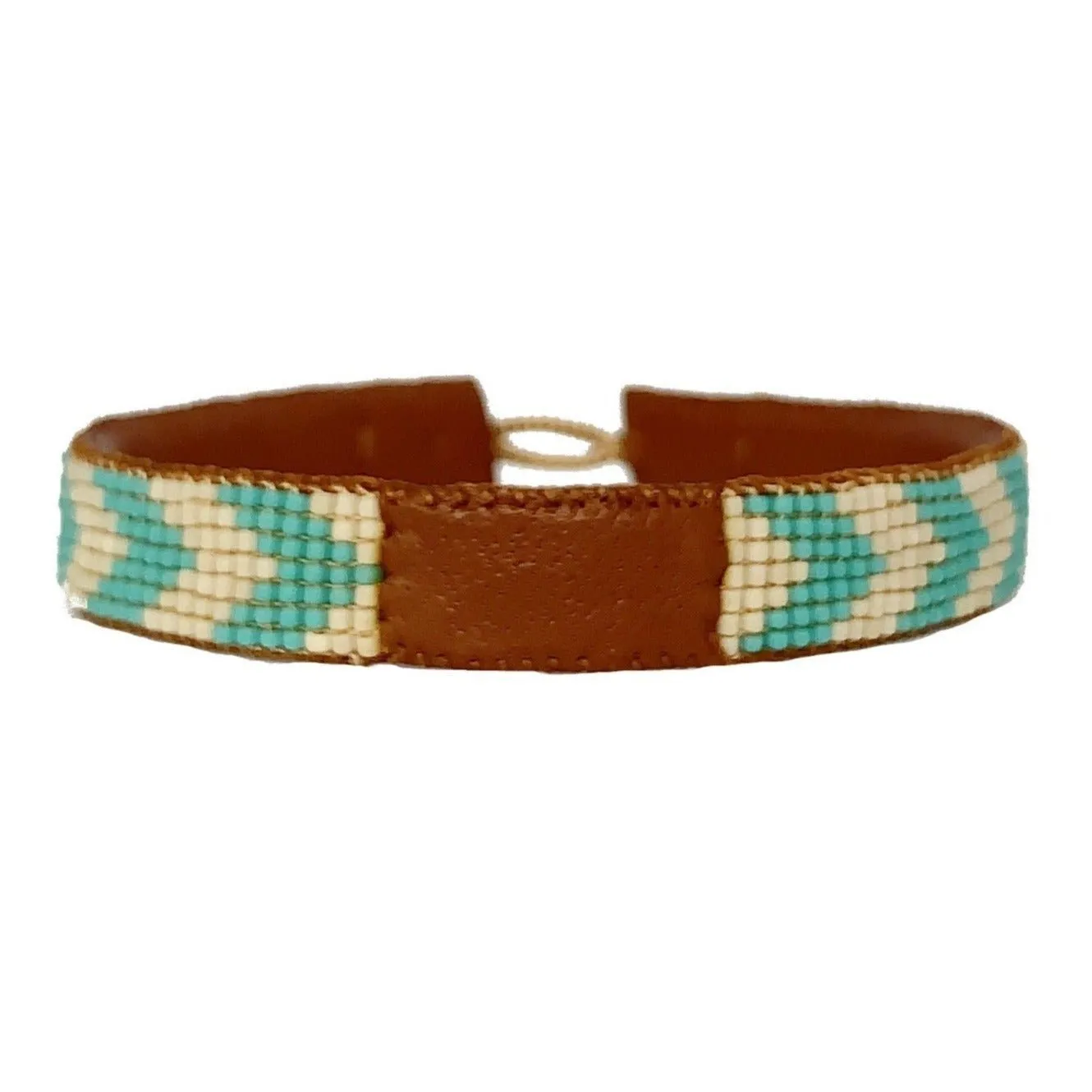 The arrow loom pattern, meticulously handcrafted from premium glass beads, is carefully stitched onto supple leather and complemented by a sterling silver IBU signature button. Available in six striking color combinations, this adjustable bracelet offers both comfort and individuality.