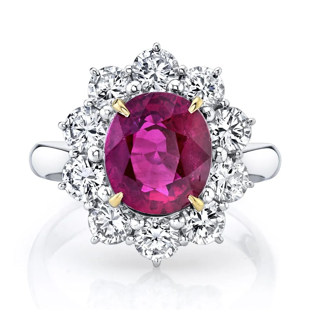 The allure of red exudes from this 4.09ct H GIA Certified Oval Ruby, adorned by 10 Round diamonds at 1.70ct sitting on a Platinum shank with 18K Yellow Gold prongs. At a total carat weight of 5.79ct, this elegant rings needs no further introduction.