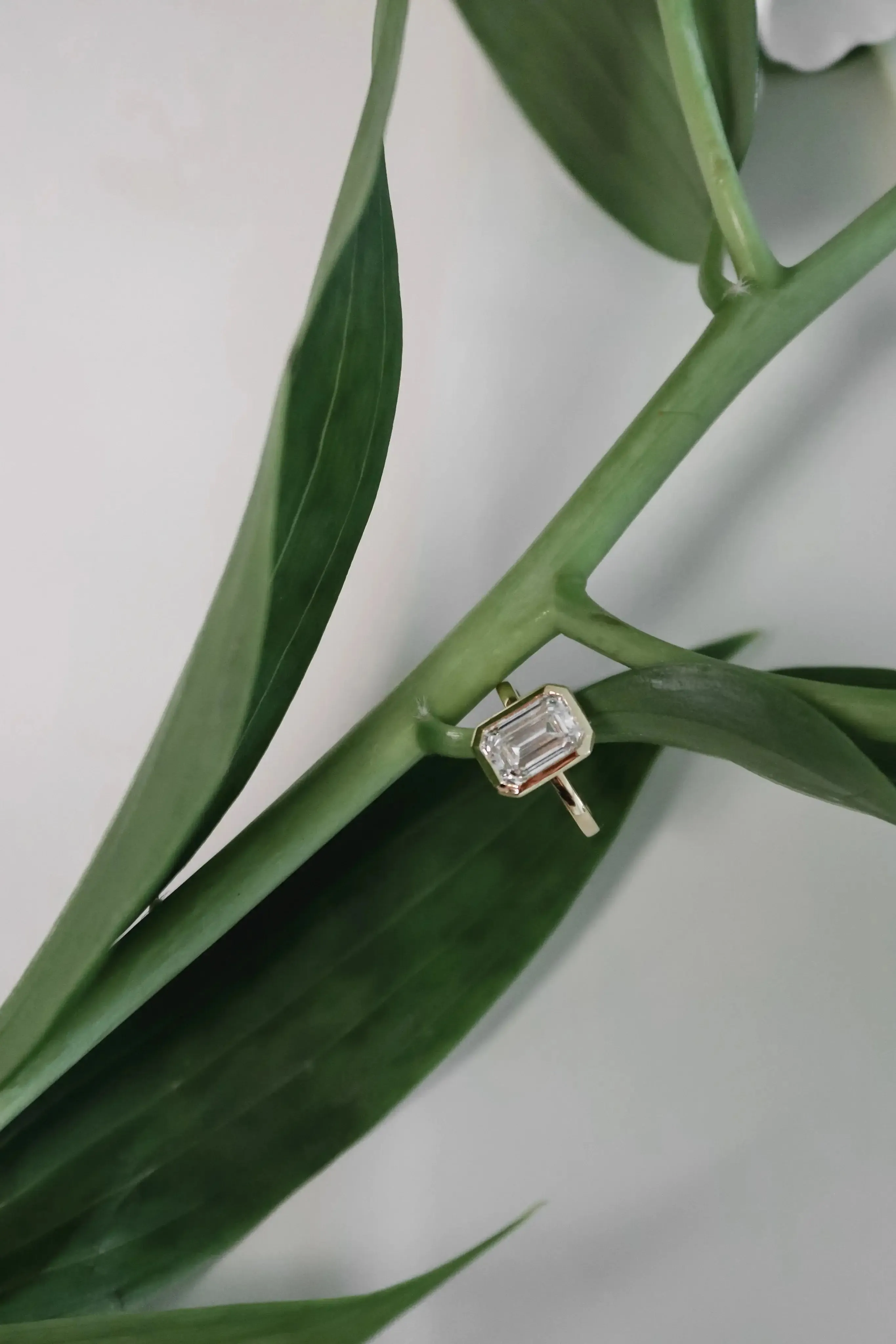 The Bezel Engagement Ring features a center stone encompassed by your choice of precious metal, for a modern yet elegant bride.